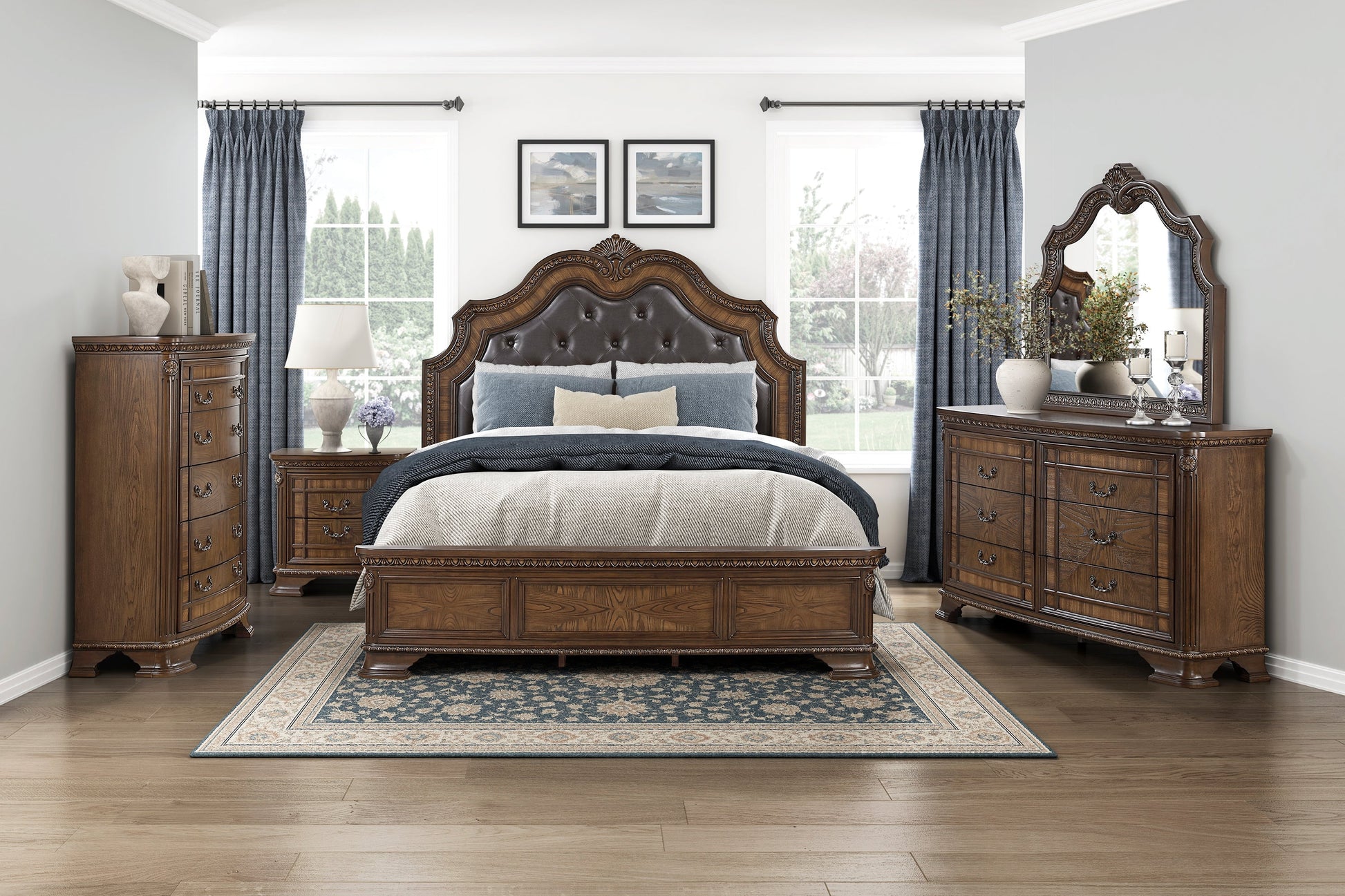 Transform your bedroom into a grand, traditional sanctuary with this stunning collection. Crafted from a rich blend of ash and zebra-wood veneers with a deep dark brown finish, each piece—including the show-stopping sleigh bed, nightstand, dresser, and chest—exudes timeless elegance. The bed features a plush, tufted faux leather headboard with intricate carvings, while the case goods offer smart storage with dovetail drawers, ball-bearing glides, and unique cedar-lined bottom drawers to protect your belongings. Ornate drop handles and a beautifully arched dresser mirror complete the look, making this collection the perfect blend of sophisticated style and practical functionality.