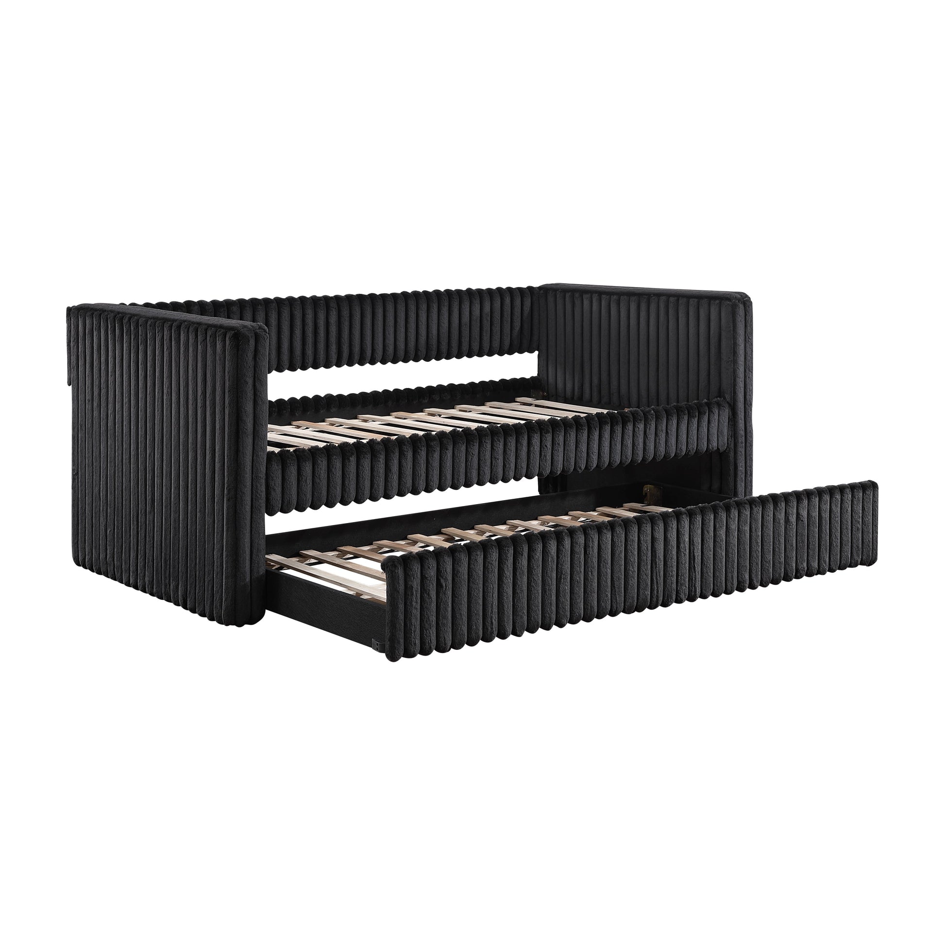 Maximize your guest room or living space with this stylish corduroy daybed, featuring a convenient pull-out trundle bed for extra sleeping space. Crafted with a sturdy plywood frame and soft corduroy fabric upholstery, this daybed offers both comfort and durability. The trundle bed, equipped with casters for easy movement, provides a seamless sleeping solution for overnight guests. Designed to eliminate the need for a foundation or box spring, this daybed offers a sleek, modern look that complements various décor styles. Assembly is required.