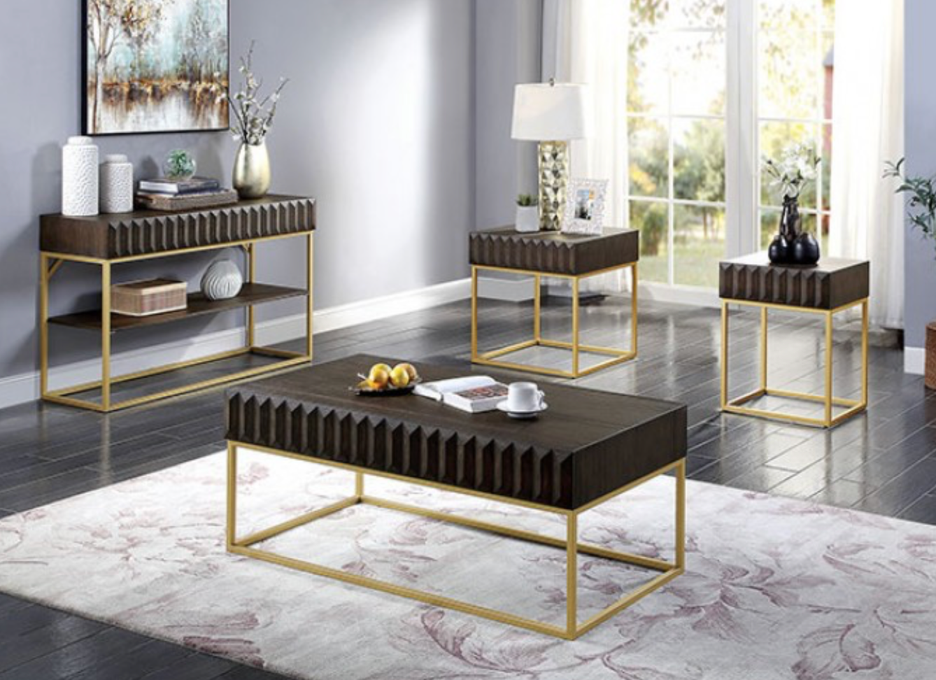 A wooden frame and metal base come together for a trendy ensemble that will fit your contemporary space well. The matte gold finish is the stand out here--the simple cube silhouette is striking in contrast to the deep walnut finish of the frame. The front panels feature a familiar pattern which conceals drawers with no visible hardware. The drawers open smoothly on ball-bearing glides.