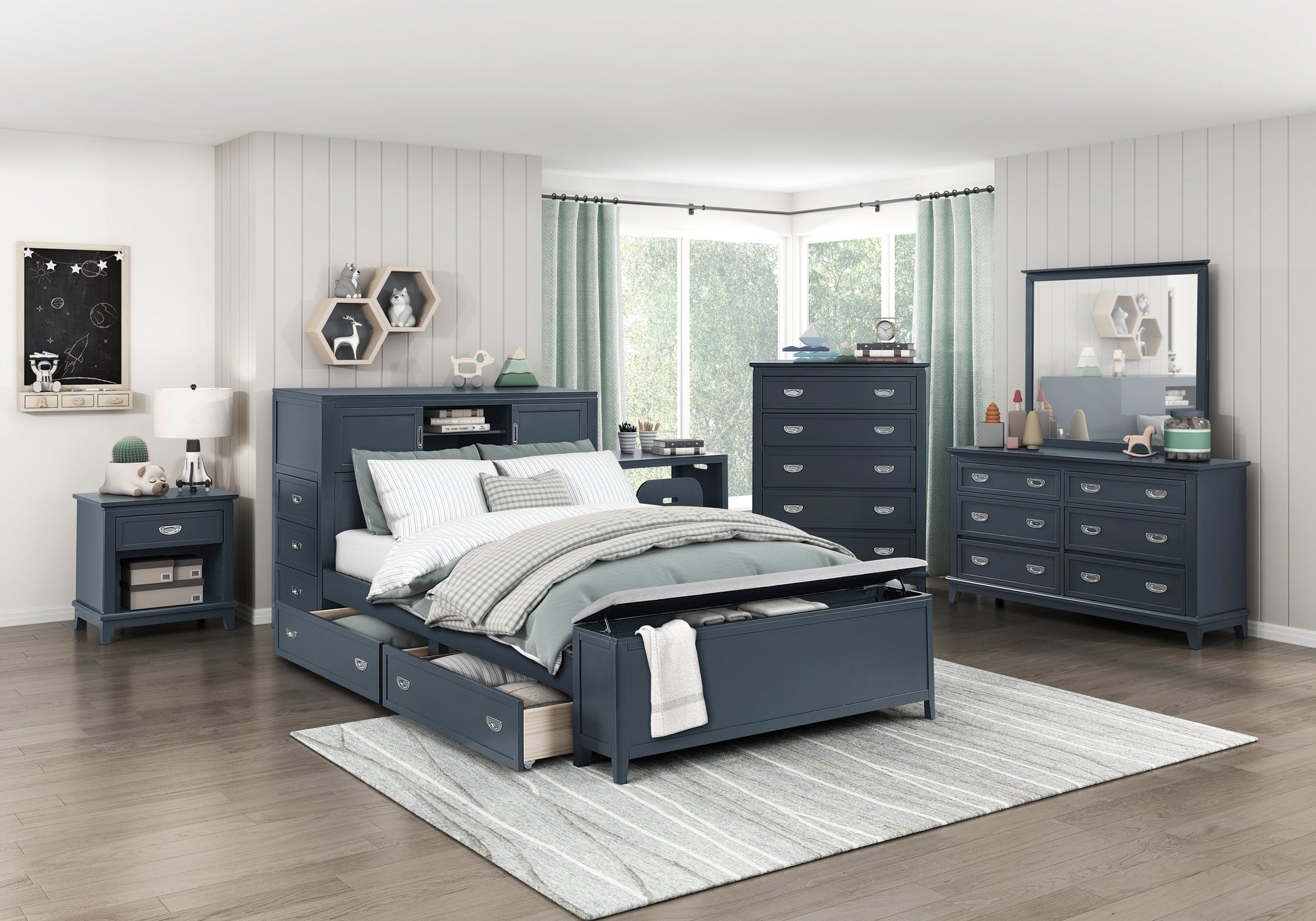 Transform your child's room with this multifunctional navy blue furniture collection. It features a space-saving bookcase bed, foam-cushioned stool, and organized storage, along with a loft bunk bed with built-in drawers and a roll-out hidden study desk. Complete the look with a navy blue storage drawer, stylish nightstand, 6-drawer dresser, 5-drawer chest, and elegant wood-framed mirror—all crafted with durable materials and sleek finishes. Each piece combines style and practicality for an organized, clutter-free, and sophisticated bedroom.