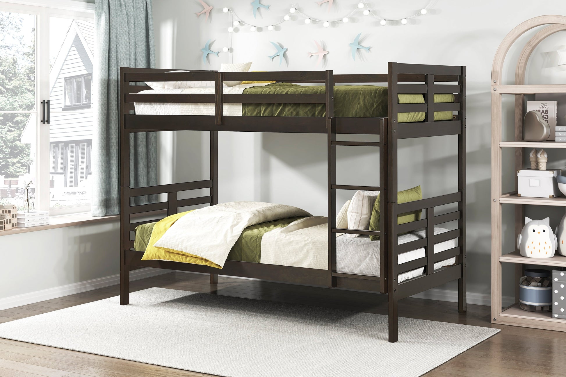 Optimize your space with our classic bunk bed, available in twin-over-full and twin-over-twin configurations. Finished in a rich dark brown or crisp white, this bunk bed is crafted from a durable blend of oak veneer, wood, and engineered wood for exceptional stability and timeless style. The top bunk features secure guard rails and is easily accessed via an integrated ladder, while included slats eliminate the need for a box spring. Perfect for children's rooms or guest spaces, this functional bunk bed provides a safe and practical sleeping solution for varying needs.