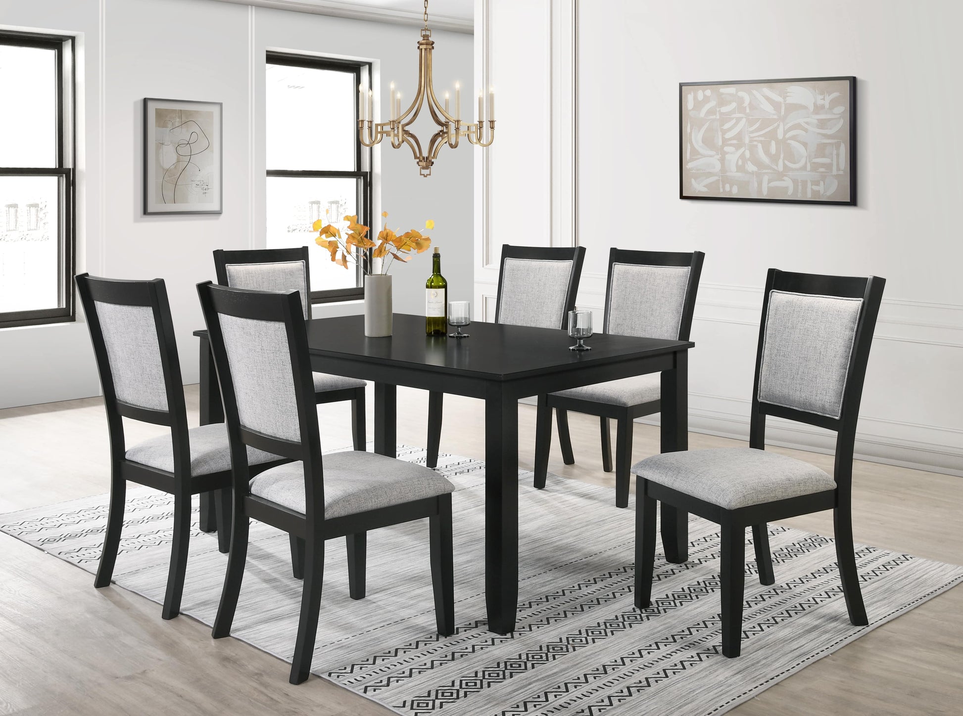 Experience the Eva Dining Room Collection for an elegant, unique look in your dining room. This black dining set features grey cushioned back chairs. The design is sophisticated and modern, creating a stylish atmosphere for dining and entertaining.
