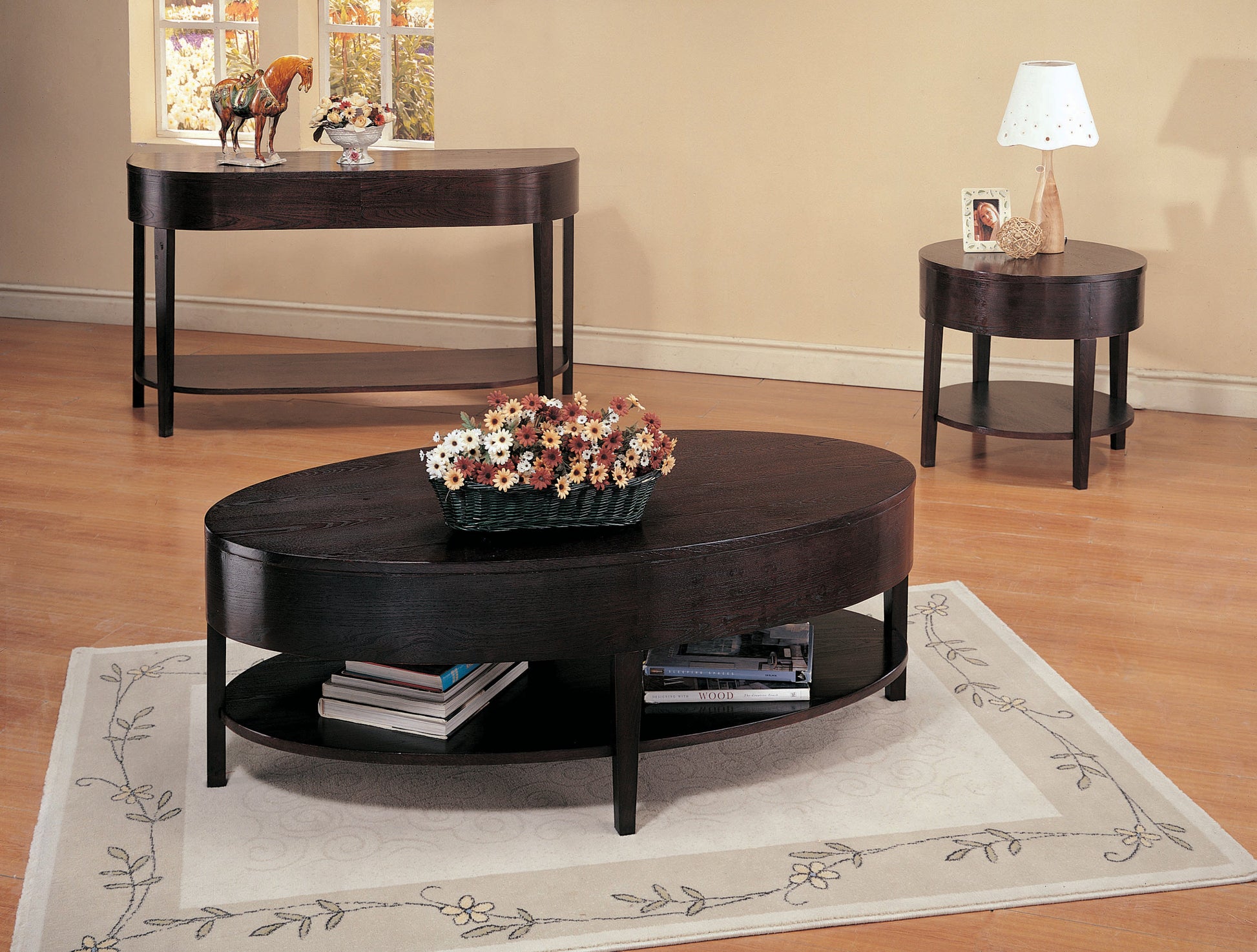 Impart your TV room with distinctive styling with this casual yet refined coffee table. It features a very spacious table top that accommodates a bouquet of fresh flowers and several glasses of wine. For those who take work home, the sturdy construction even permits you to prop your feet up and pound away on your laptop. Bottom shelf acts as storage for associate notebooks and folders. Finished in a rich dark cappuccino.