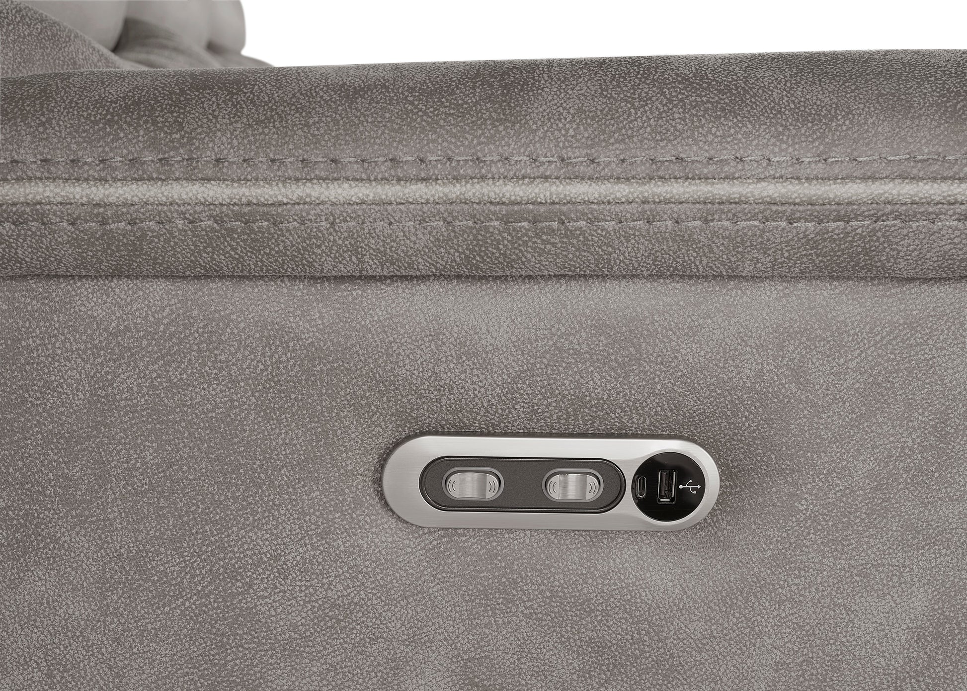 Experience the ultimate in comfort and style with the Kamari Motion Living Room Collection. Sink into the sumptuous suede-like softness of its dappled gray upholstery, crafted from a blend of polyester and PU fabric. Meticulously tailored with triple roll backs, bucket seats, and wrap-around arms adorned with a tasteful contrasting welt, this collection exudes sophistication. Fully upholstered chaise recliner footrests offer unparalleled relaxation, while the power option allows effortless positioning at the touch of a button. Built for enduring comfort and support, hardwood and manufactured wood frames, resilient foam and polyester-wrapped coil spring cushions, and no-sag seat suspension ensure years of enjoyment. In the power version, stay connected with built- in USB chargers, and enjoy added convenience with a loveseat featuring a handy center console for remote controls and built-in cupholders to keep beverages close at hand. Versatile in style, this collection effortlessly complements any decor, making it the perfect addition to your living space.