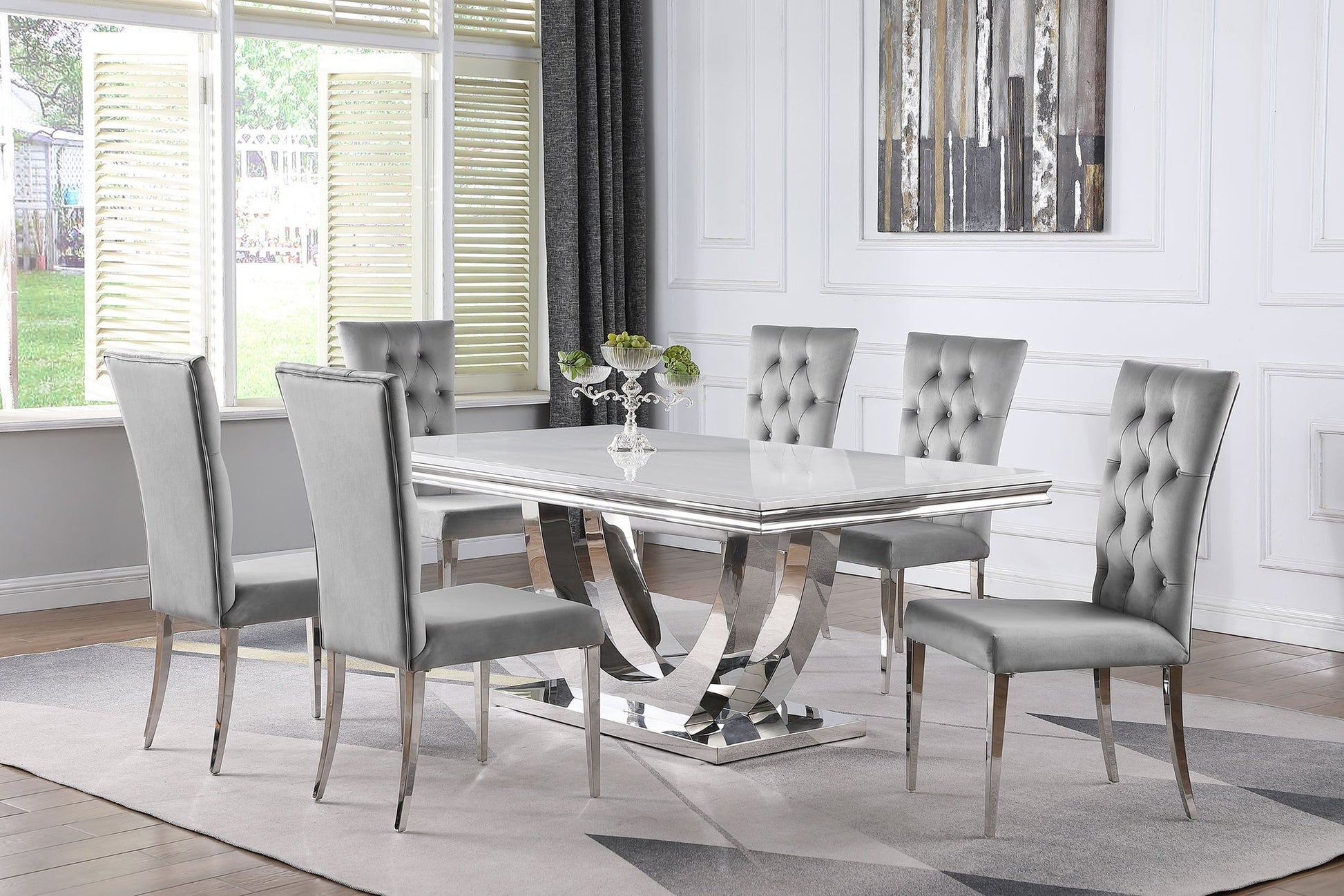 Host a party at this sophisticated modern glam dining table set, designed with a gorgeous polished chrome finish across its demilune pedestal base and slender dining chair legs. The spacious rectangular table top presents a faux marble top and seats 4-6 comfortably and offers plenty of space for family and friends. Slide up in a Parson style dining chair, upholstered in a luxurious velvet fabric that offers a contemporary flair and soft look and feel. Button tufted backrests fan out toward the top, offering a modern expression to their classic silhouettes. Lastly, a beveled edge surrounds the table top, presenting a hint of intricate texture to the sleek aesthetic.