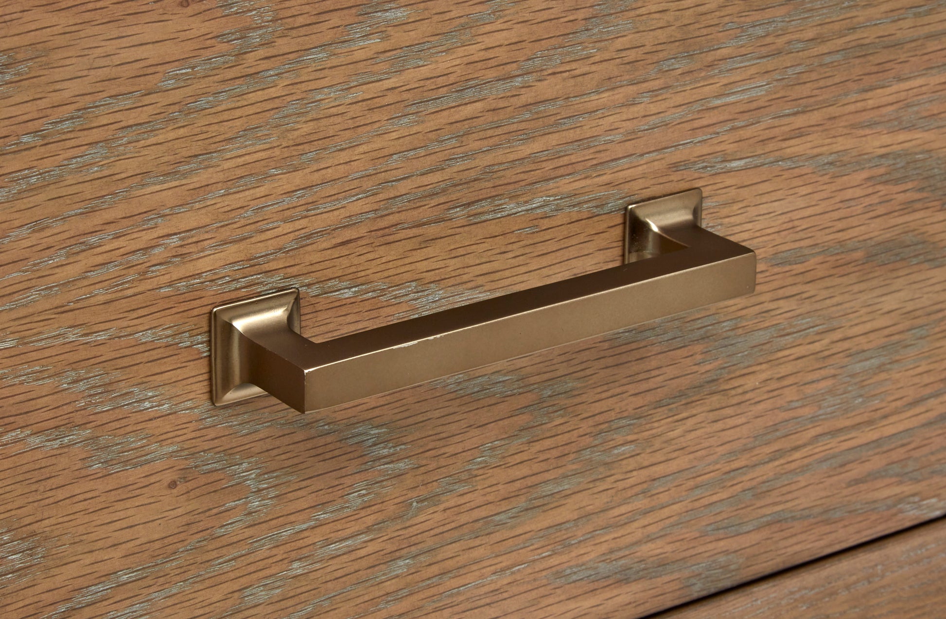 With its sophisticated, squared silhouettes and modern lines, Lindon is nothing short of iconic. A Lindon bed makes a bold design statement in any bedroom while creating an undeniable focal point. Dress it up or down, traditional or modern—its beauty has no limits. The coordinating casegoods in this group convey Lindon’s streamlined personality while design details such as open metal bases tie all the pieces together. Alluring finishes of Belgian Wheat and Coffee Bean highlight the group’s random Cathedral/ Quartered Knotty White Oak veneers and hardwood solids. Burnished Brass hardware adds a finishing touch to this expressive bedroom collection.