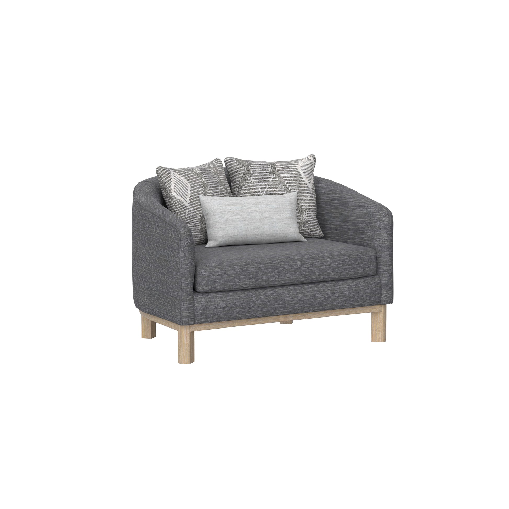 If you thought amenities were only for motion furniture, think again. The completely stylish Maeve collection offers a console with hidden storage, stainless steel cupholders, a wireless charging station, and a Bluetooth speaker with a USB charger. An extra-wide, barrel-shaped accent chair is accompanied by a matching barrel-shaped storage ottoman. The spacious wedge of the sectional makes for extra cuddling space, while the gorgeous dark gray fabric sits atop a sandy-toned exposed wood base. Get the whole package with the Maeve collection.