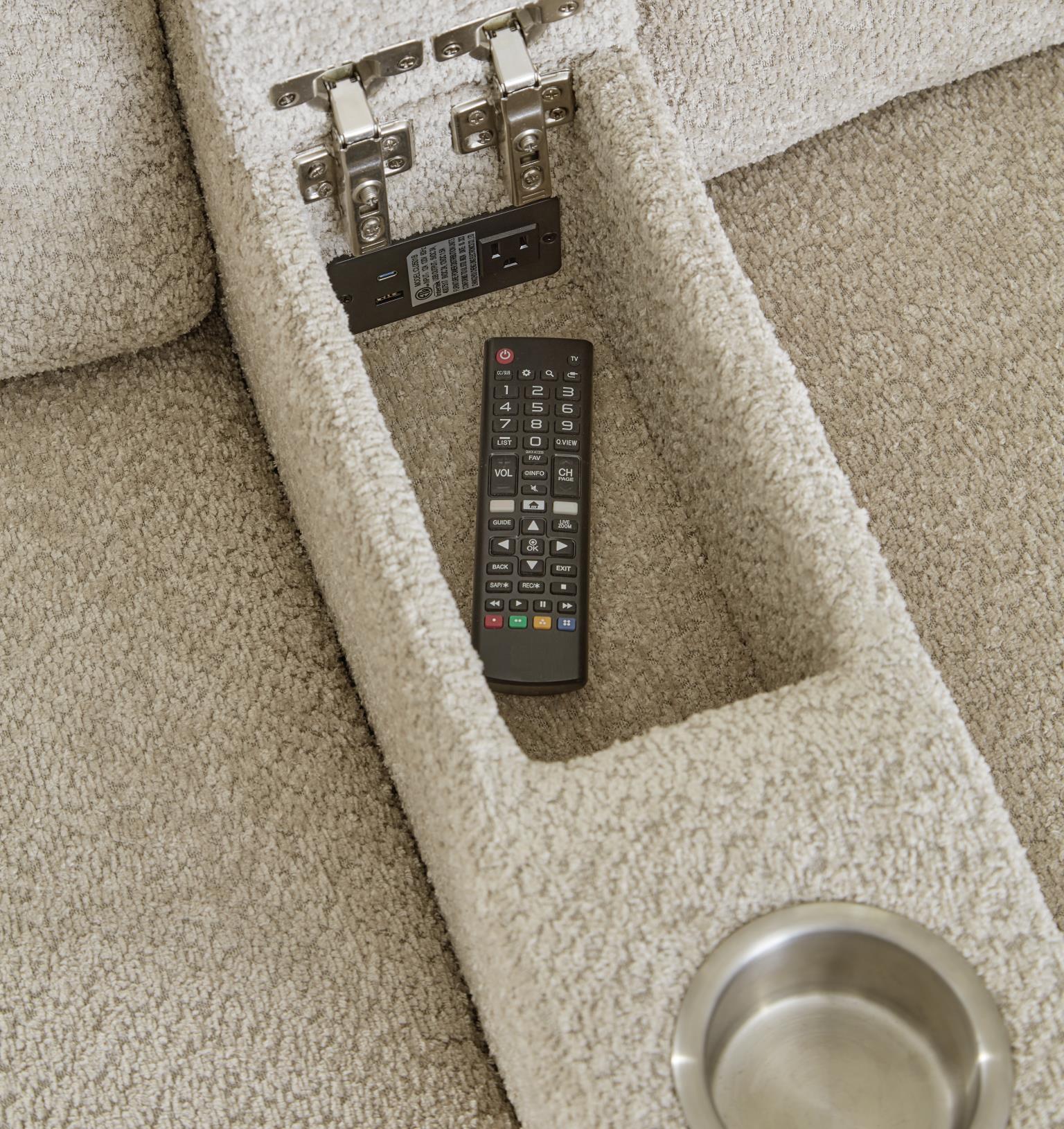 Covered in gorgeous Buttercream fabric, this transitional sectional features convenient power headrest and recline functions. Modesto's unique slender storage consoles feature a power center and a cupholder, offering a modern spin on the traditional sectional console. Two comfort arm pillows come included, ensuring that you maintain your preferred level of comfort no matter how you choose to relax.