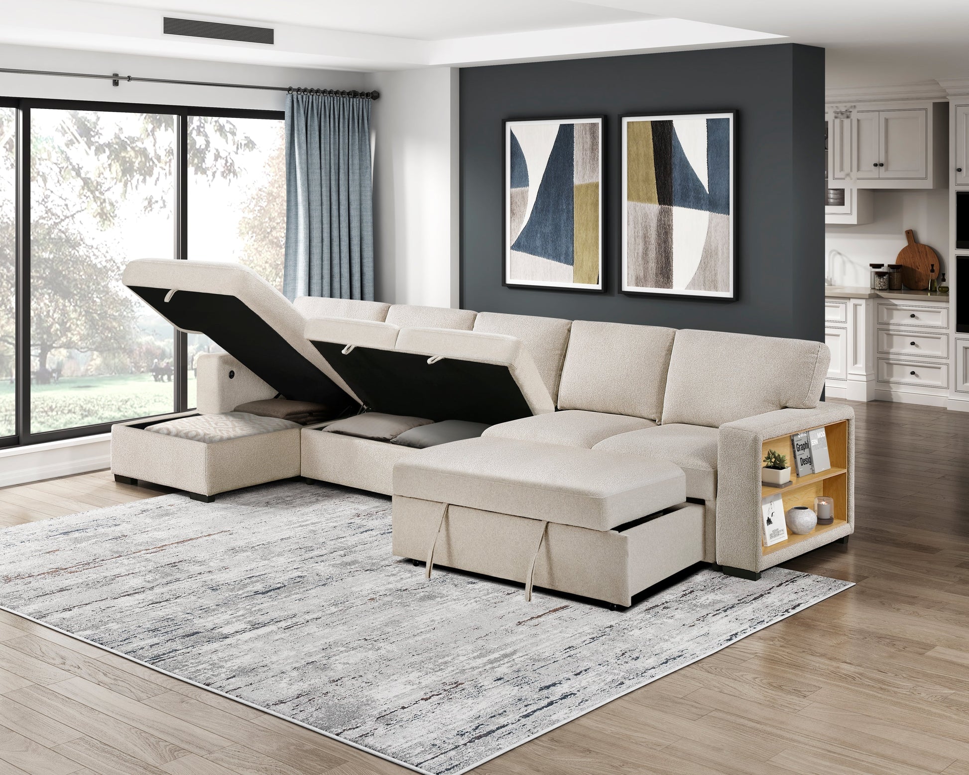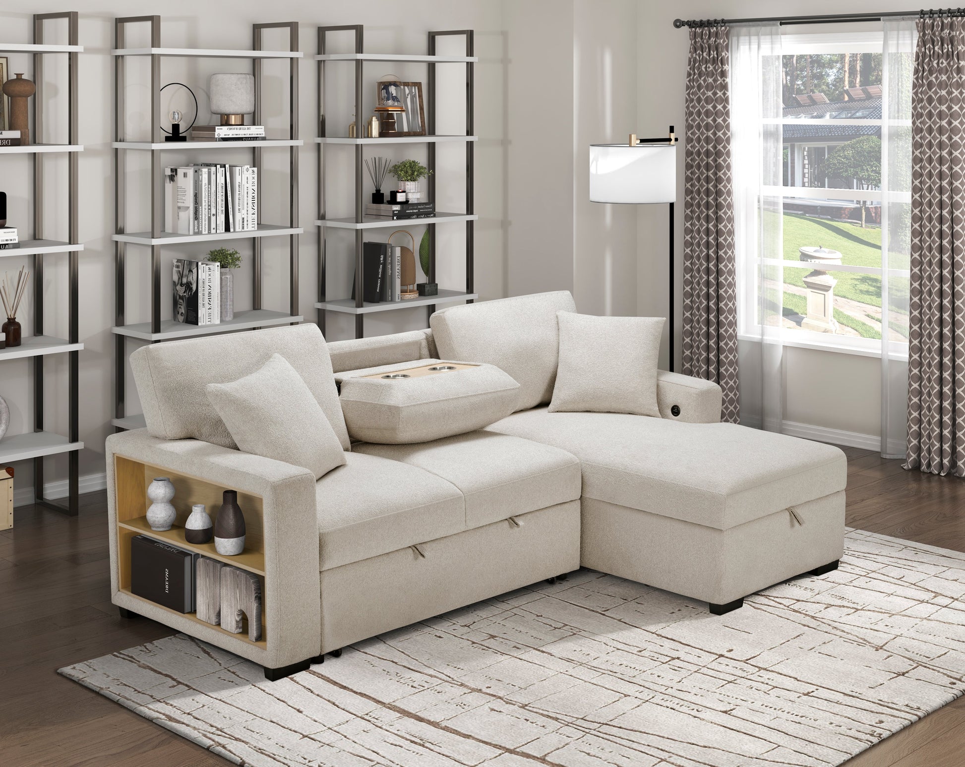 Providing a casual look and plentiful functionality to your living room is the Pompano Collection. The pull-out bed that is stored beneath pops up to create ample space for full leg extension while the lift-top seat of the chaise opens to reveal hidden storage perfect for blankets and pillows. Additional functionality comes in the form of the side mounted shelving units located within the outer face of the side arms and the USB charging ports, allowing you to keep your device close during your time of relaxation. Coordinating seating is provided by the swivel armchair, it’s 360-degree turning radius allowing you to interact with your family and friends. The collection is covered in beige boucle fabric, its neutral tone and satisfying texture a subtle complement to your home’s décor.