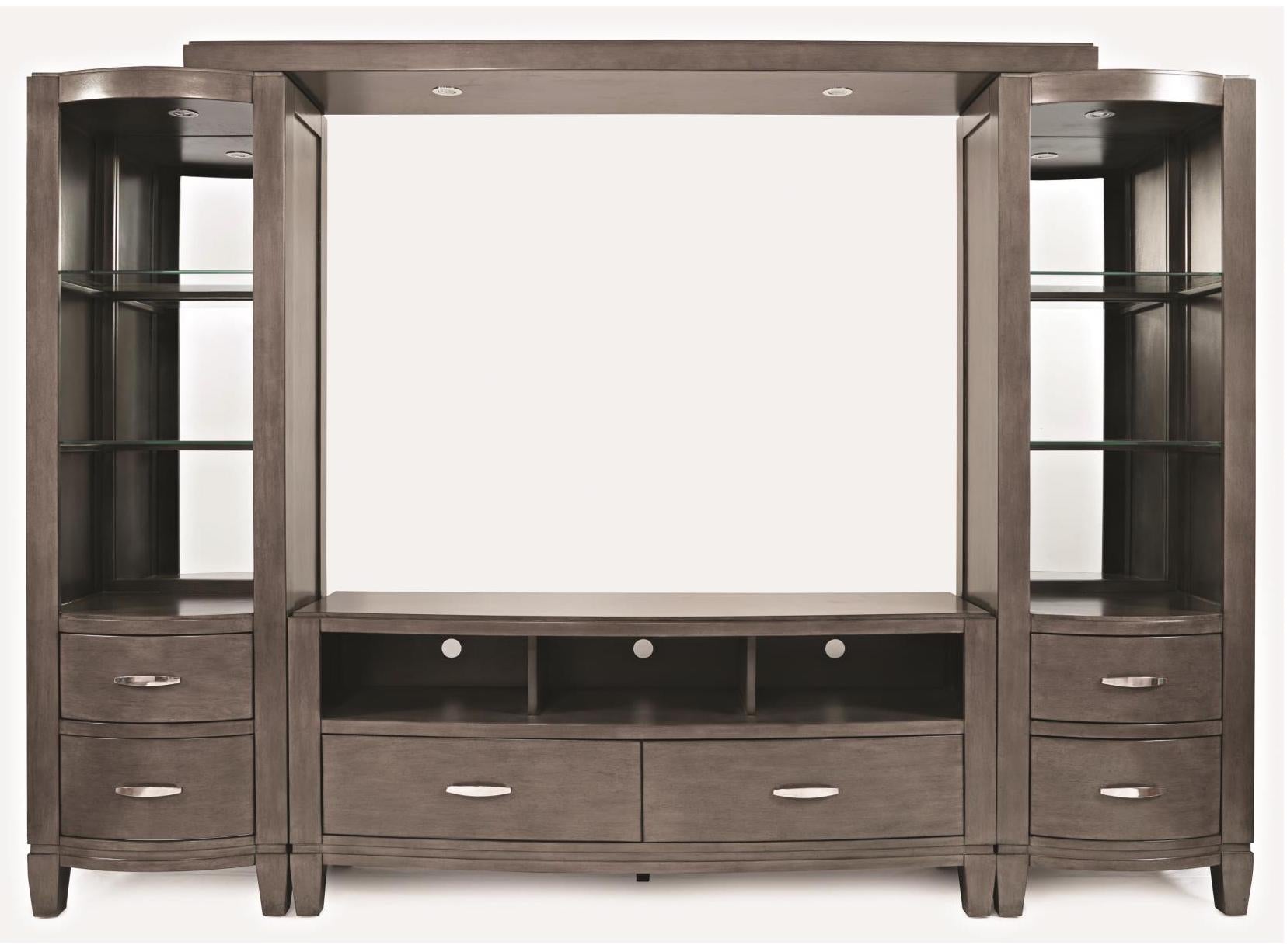 With smoothly rounded storage drawers, plenty of display space, and no shortage of style, this collection is just the infusion of chic your living space has been waiting for. Features brushed nickel drawer pulls.