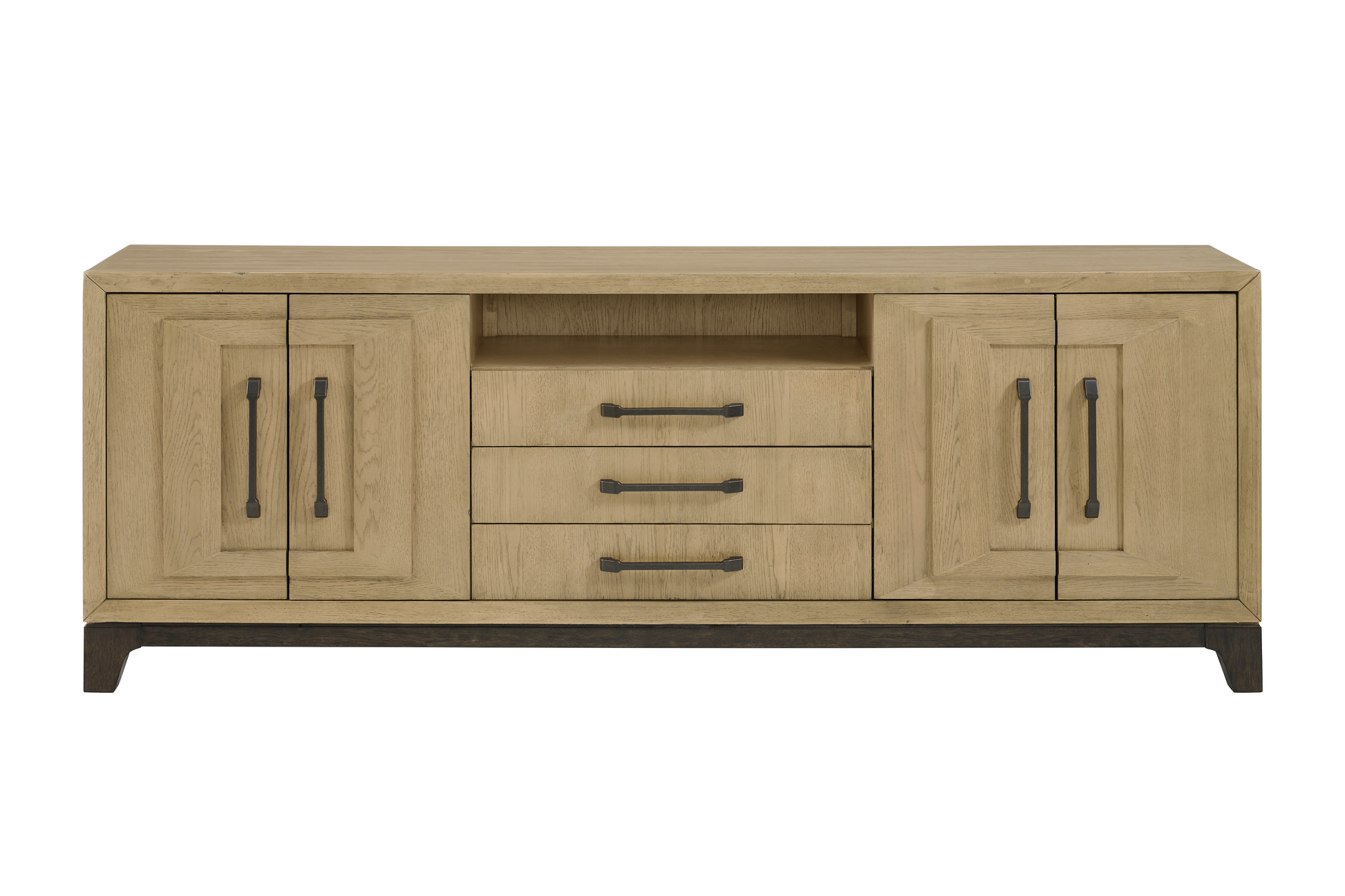 The Sutton Place entertainment console embodies relaxed contemporary style with a focus on the natural beauty of oak. Light wire-brushing enhances the tight-grain oak veneers sturdily crafted over hardwood solids. Dark bronze bar pull hardware adds a subtle touch of contrast to the warm caramel tones and cocoa base. Designed with modern functionality in mind, the console includes an open shelf for electronics, three spacious drawers, adjustable-height shelves, and discreet cord cutouts behind cabinet doors to keep your media space organized and clutter-free.