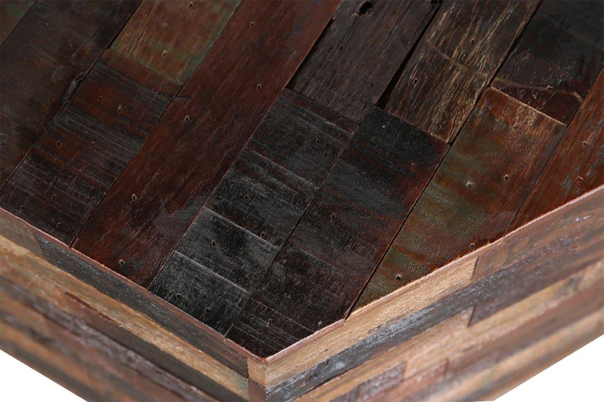 Crafted of planked and richly variegated, hand-finished reclaimed woods of Mango, Sheesham and Acacia. Multi-step, reclaimed Rustic Brown finish. Handmade iron base.