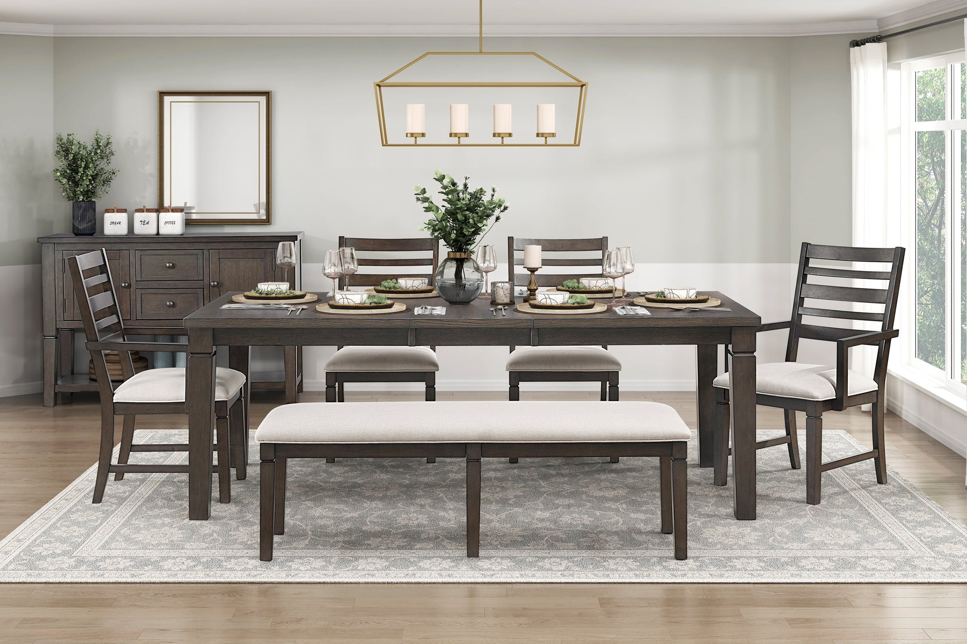 Elevate your home with this sophisticated dining collection, finished in a rich dark espresso. This versatile collection includes an extendable table that adapts to seat up to six guests, and a coordinating server with ample storage from its dovetail drawers, cabinets, and adjustable shelves. The arm chairs, side chairs, and dining bench all feature a sturdy wood frame and comfortable upholstered seating. Crafted from a durable blend of oak veneer, wood, and engineered wood, this collection delivers a perfect blend of timeless style and practical functionality for your dining room or kitchen.