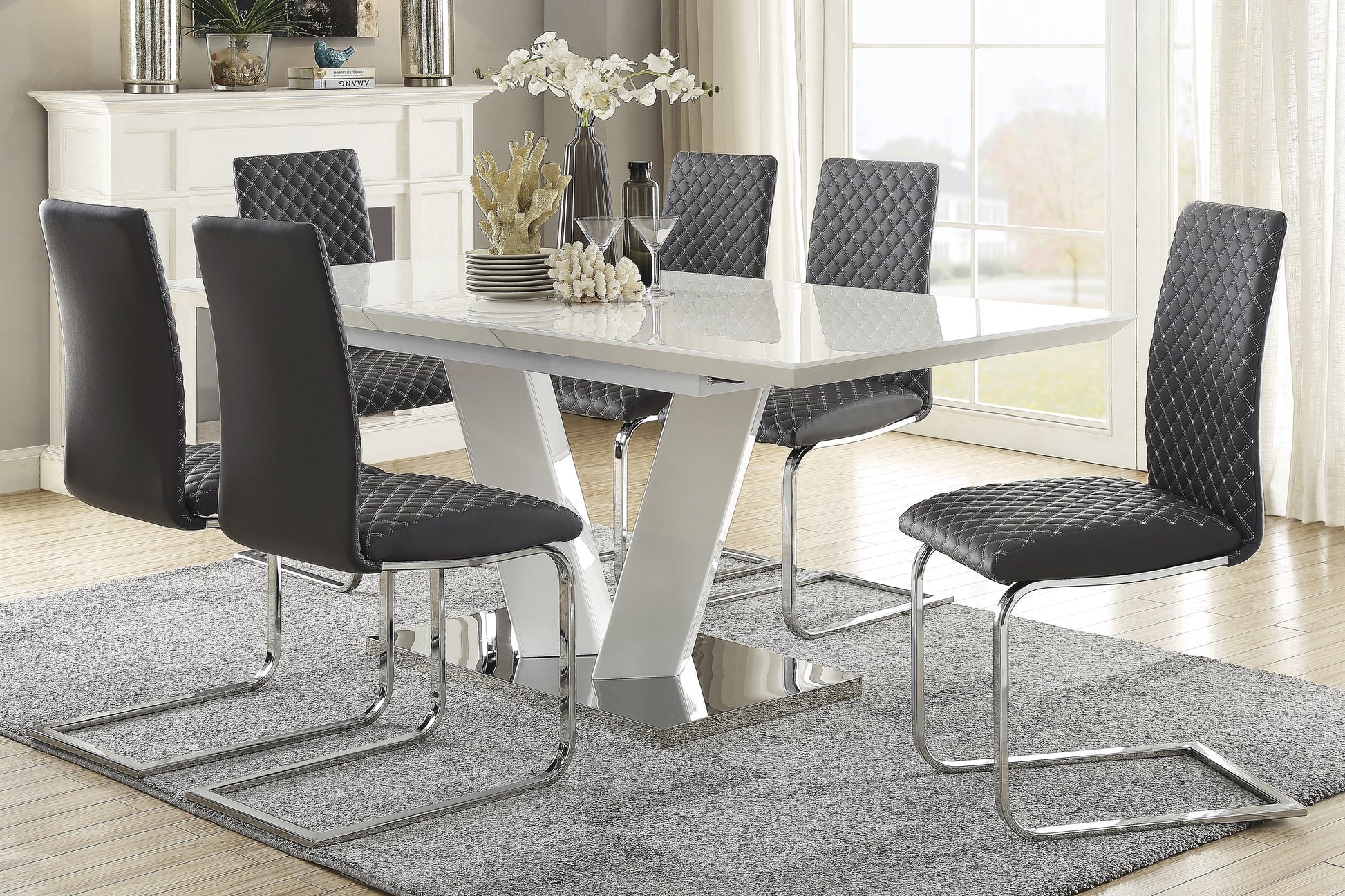 Sleek contemporary styling provides the platform from which you will create your casual dining space in the Yannis Collection. Ultra-bright high gloss finish of the tabletop and V-shaped support provides a distinct contrast to the high polish chrome base plate. The continuous base of the accenting chairs rises to support gray bi-cast vinyl seats with diamond pattern stitching providing additional visual interest. A smooth glide system opens with ease to reveal the self-storing butterfly leaf.